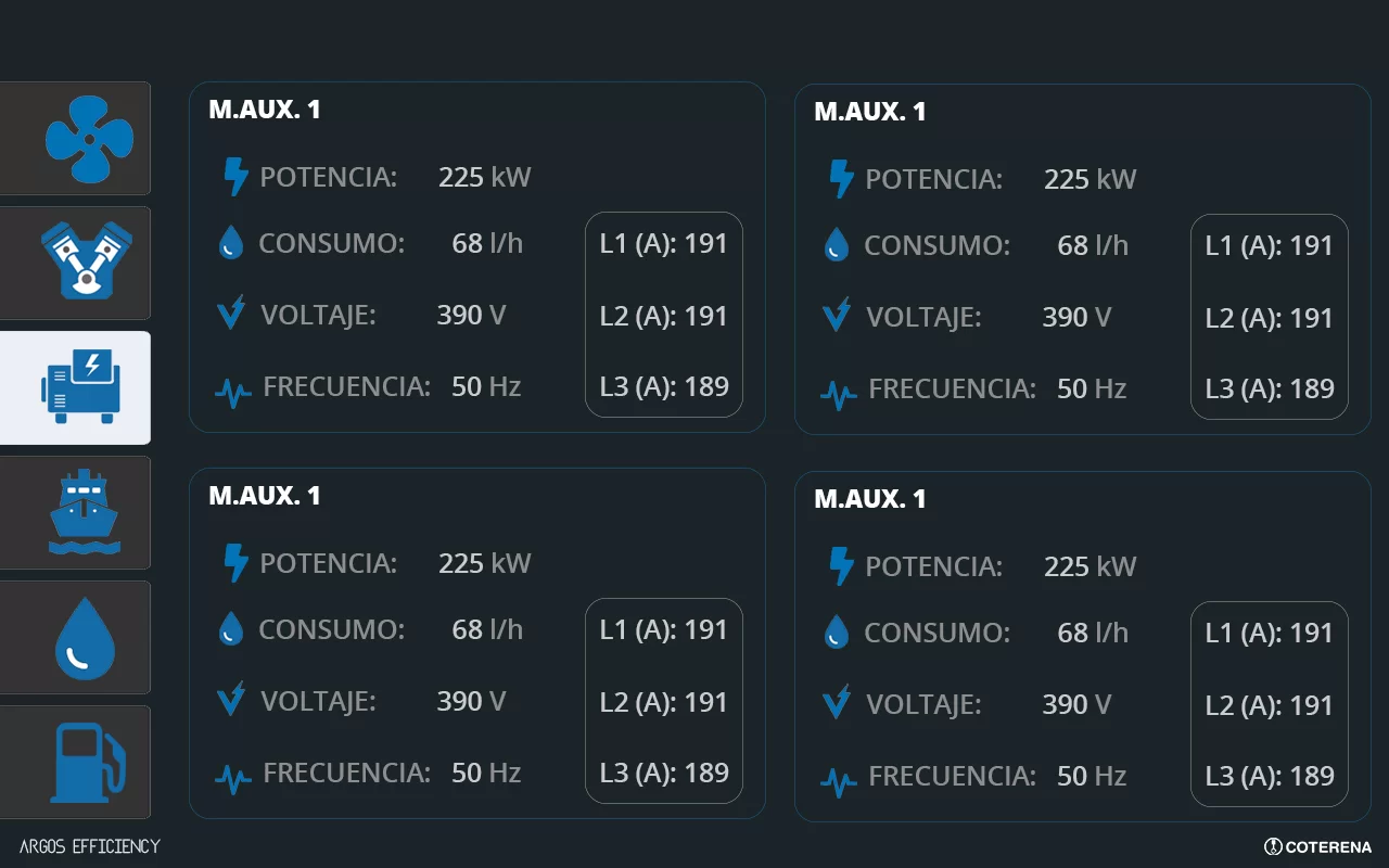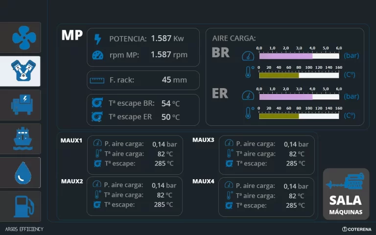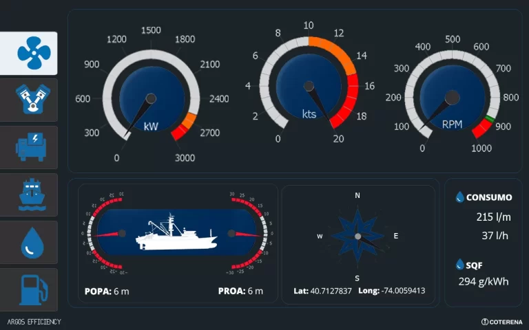 Mediante la monitorización en tiempo real de los consumos y prestaciones mecánicas del sistema de propulsión, generadores auxiliares y módulos complementarios de registro, el equipo ARGOS ofrece soluciones de optimización de la Eficiencia Energética y Mecánica orientados a mejorar las prestaciones y condiciones de una navegación eficiente.