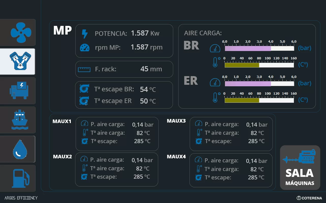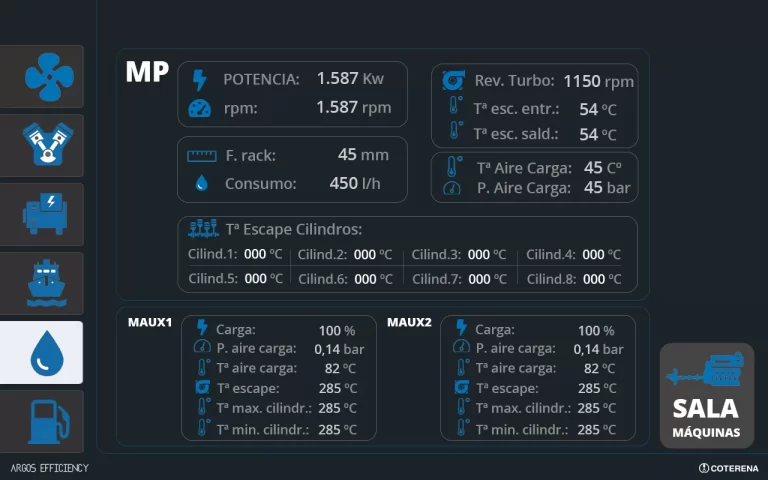 - Información del estado de potencia del motor principal en relación a los parámetros y consumos efectivos del buque.
