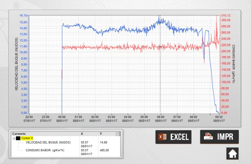 El Software de Análisis genera gráficos preestablecidos sobre las condiciones de navegación, junto a la creación de bases de datos en formato Excel para su posterior gestión e interpretación. Las bases de datos generadas a lo largo del tiempo, permiten el estudio de potenciales desviaciones del sistema propulsor y generador, generando valores de cálculo para el desarrollo de indicadores de Eficiencia Energética